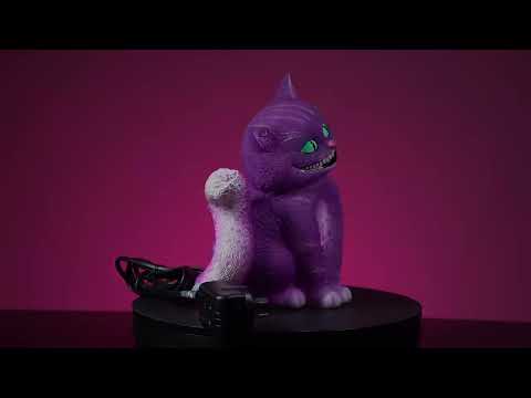 - LED -bordslampa av en flirande gal katt med livliga turkosögon