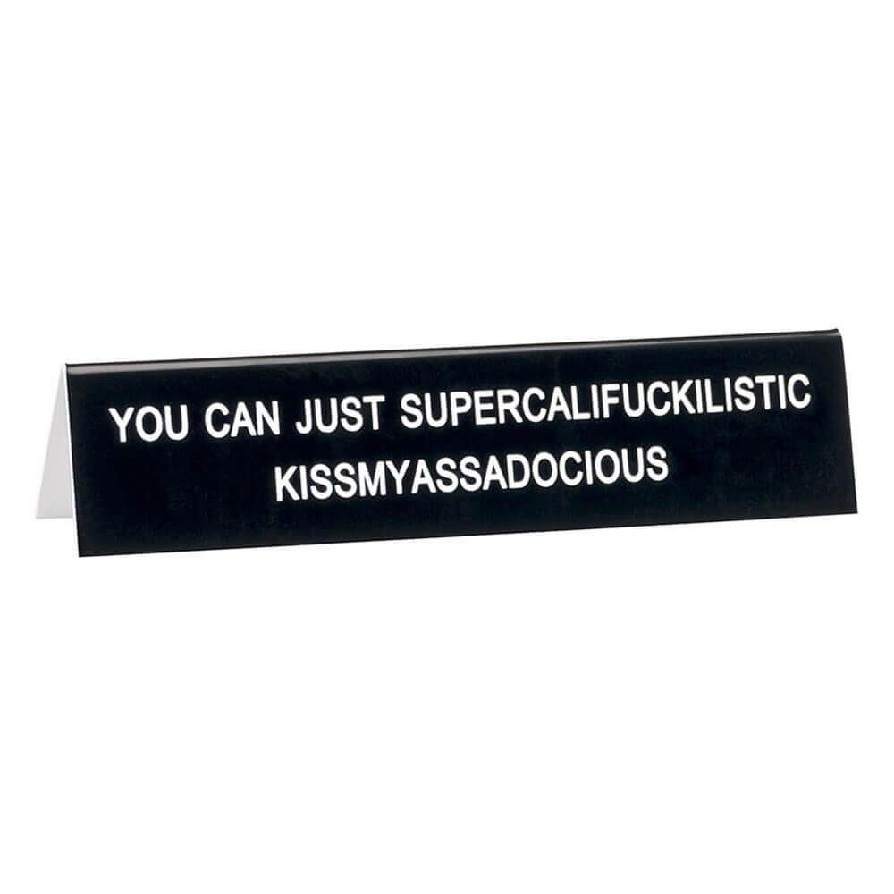 Bryt upp monotonin i arbetet och ta med några lols till kontoret med detta svarta skrivbordsskylt från Say What?. Bildtext läser: "Du kan bara superkalifikilistiska kissmyassadocious". Produktmätningar 14,5 cm x 3,5 cm.
