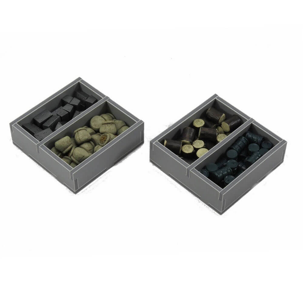 Der er tilstrækkelig lagerplads til de realistiske ressourcetokens, metalmønterne og også til syv kampskiver, hvis du har dem.