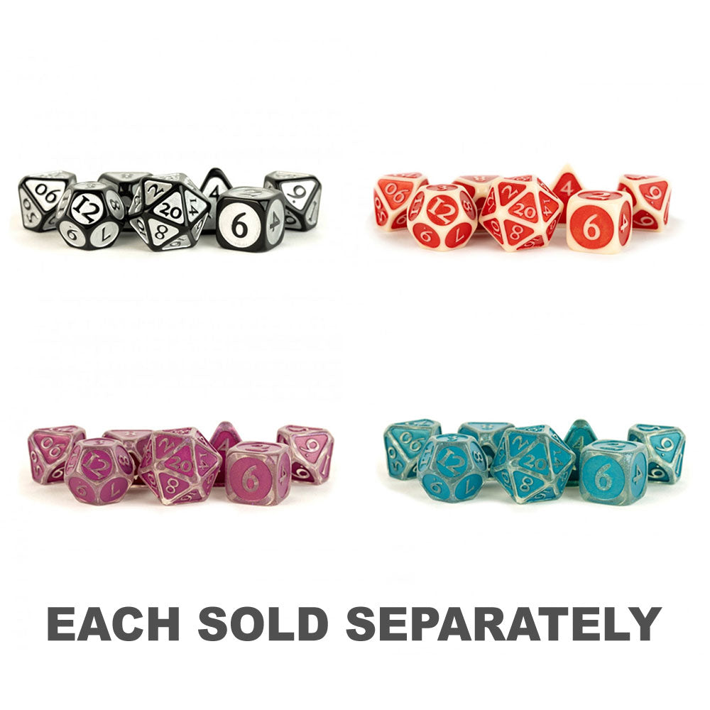 Hvert sæt er støbt i akryl og derefter omhyggeligt fyldt med smuk emaljemaling. Vi anbefaler at rulle alle metal terninger på polstrede overflader som polstrede terningbakker.