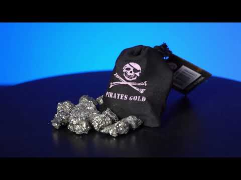 Pose af gylden pyritskat!. Pyrite eller 'Fool's Gold' har en stærk lighed med ægte guld med sin metalliske glans og bleg messingfarve. Perfekt til børn piratfester!