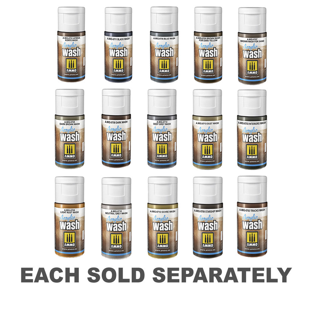 Waschungen sind eine der ältesten und wichtigsten Modelliertechniken und werden von allen Modellbauern für Motive und Dioramen aller Art und Themen verwendet. Entwickelt mit zwei unterschiedlichen Formulierungen, die sowohl Emaille-Typ als auch Acryl-Typ umfassen. Jeder Typ verfügt über unterschiedliche Qualitäten, um sich an die unterschiedlichen Bedürfnisse unserer Modelle und die Vorlieben jedes Modellbauers anzupassen. Beide liefern hervorragende Ergebnisse und sind sehr einfach anzuwenden. Der Vorteil des Acryllacks besteht darin, dass er weder giftig noch riecht, sodass die Verwendung zu Hause oder in der Nähe Ihrer Familie kein Problem darstellt. Außerdem trocknet er schneller als der Emaillelack, sodass Sie den Vorgang in kürzerer Zeit abschließen können . Das Acrylwaschgel wird in einer Flasche mit Dosierverschluss geliefert, mit der Sie ein paar Tropfen zur späteren Verwendung auf eine Palette oder einen Behälter geben können. Obwohl das Fassungsvermögen der Flasche 15 ml beträgt, können Sie mit dem Spender Produkt sparen und präziser arbeiten