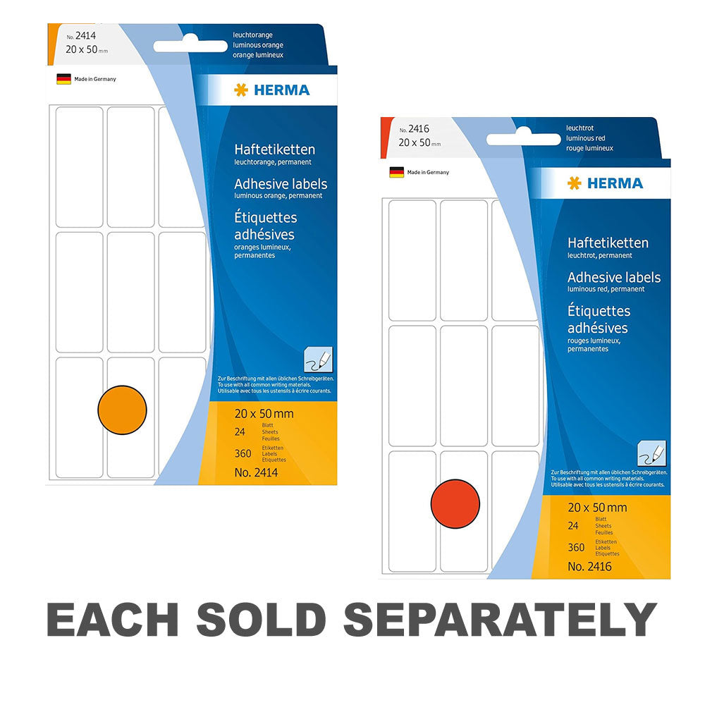 Illuminate your labeling tasks with Herma Multi-Purpose Luminous Colored Labels! This pack includes 20 labels, each measuring 20x50mm, featuring a luminous finish in assorted colors for high visibility and impact. Whether for organizing, crafting, or creative projects, these multi-purpose labels stand out in low-light conditions or crowded environments, ensuring attention-grabbing results. With a strong adhesive backing, these labels adhere securely to various surfaces, providing versatility and excitement for all your labeling needs. Get ready to light up your projects with Herma Multi-Purpose Luminous Colored Labels!