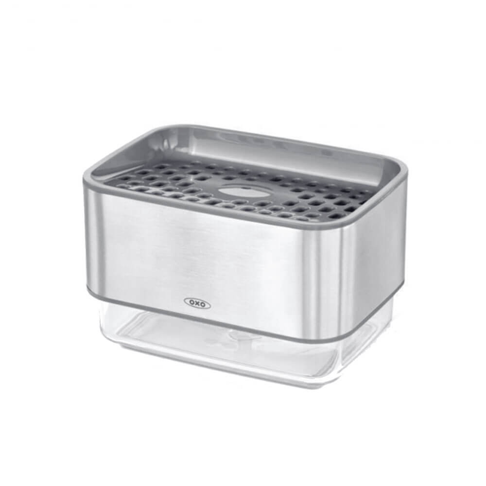 This multitasking sponge holder will keep the sink area neat and clean. The holder easily dispenses soap onto your sponge with a quick one-handed press while the drip tray catches excess water. The ventilation holes in the top help the sponge dry quickly.