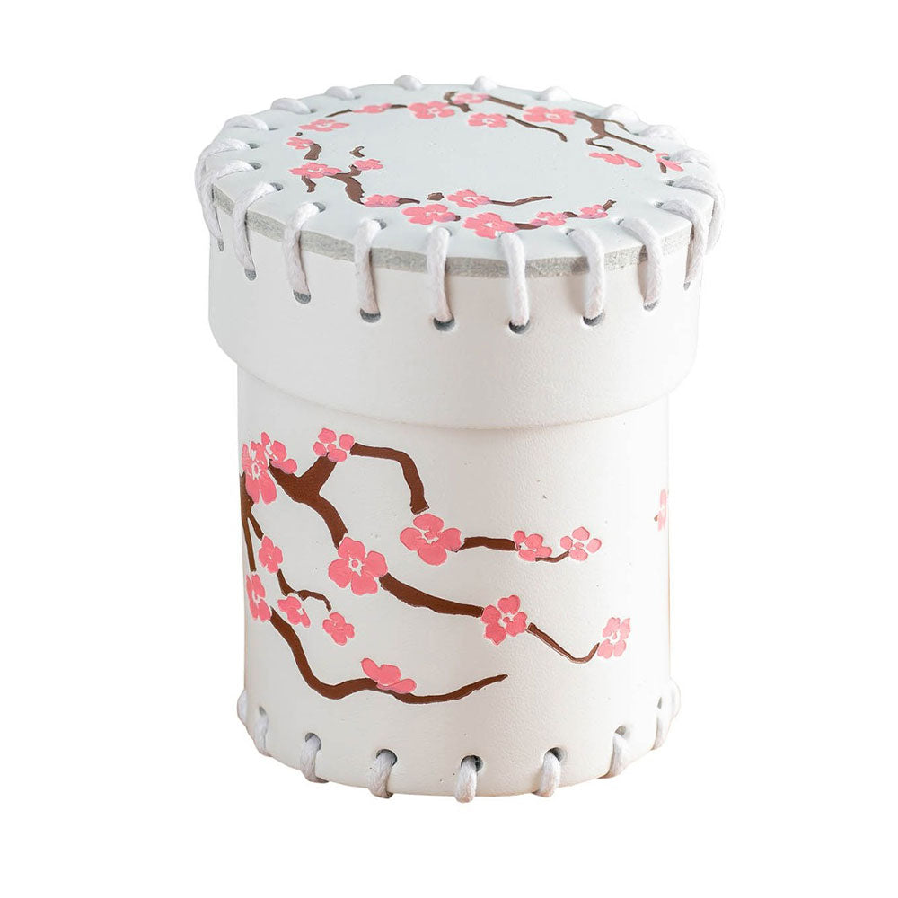 That experience has inspired us to create this Japanese Leather Dice Cup. We made it of natural leather in white color and adorned its lid and body with a colorful print; it shows a brown cherry tree branch as it's beginning to that is starting to come to life with pink flowers!