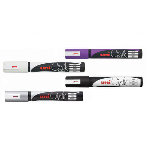 Uni Liquid Chalk Markers utilise water-based pigment ink so you can mark on windows, glass, mirrors, plastic and metal surfaces with ease. The ink won't wash off in the rain, yet is easy to remove with a damp cloth. For permanent application the markers can also be used on chalkboards for a bold statement.