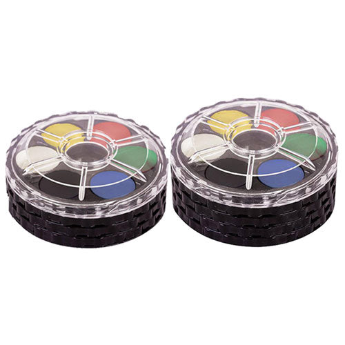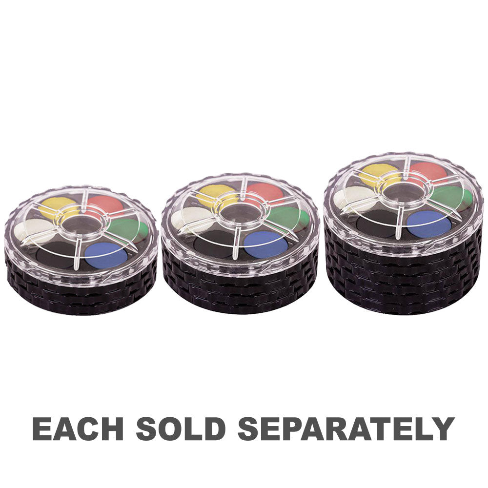 These Watercolour Paint Disks 18's are a convenient and affordable pan style paint. The compact 3-disc palette holds 18 colours and stacks together for easy transportation and storage. Unscrew each disc to reveal the paint pans. Great for students in the art and classroom or plein air (outdoor) painting and working in the studio.