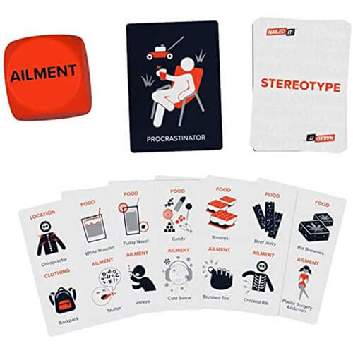 • El juez voltea una tarjeta de estereotipo y lanza el dado de espuma gigante para seleccionar la categoría de la ronda: ubicación, comida. , Ropa O Dolencia. Los jugadores seleccionan una carta de categoría de su mano y crean una historia divertida sobre qué elemento coincide mejor con ese estereotipo.