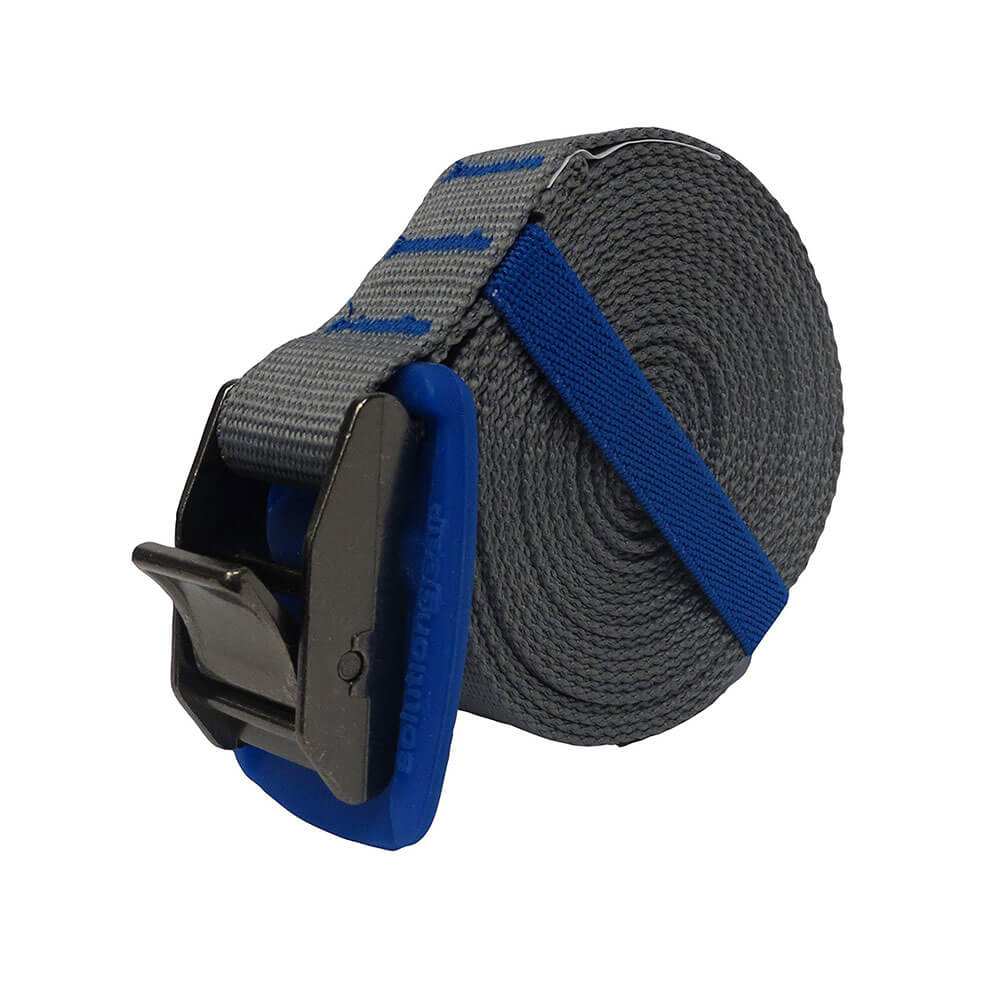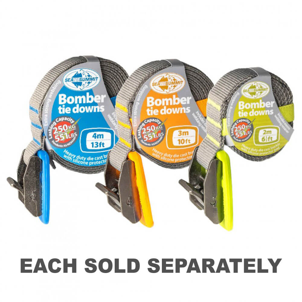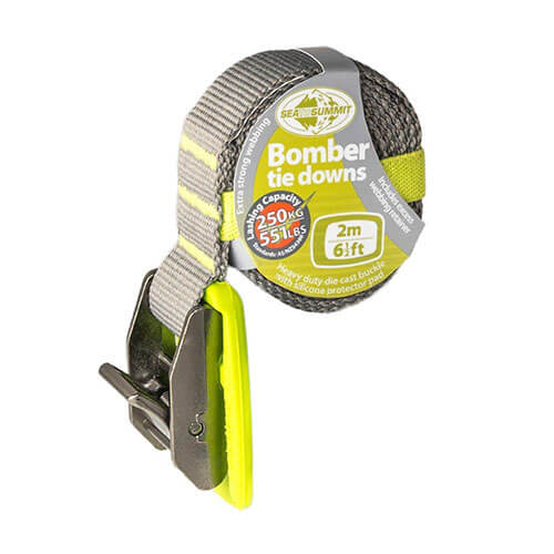 Detta alla ändamål binder ner har gjutna nickelpläterade zinklegeringspännen med en gummibotektor. Webben har uppgraderats till 25 mm UV -skyddad polyester -webbing. En praktisk, färgkoordinerad elastisk behållare för webbbindande håller knytnedgångarna snyggt lindade när de inte används.