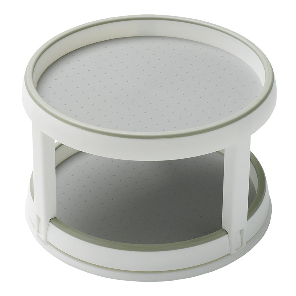 Den breda basen ger stabilitet för den tiered skivspelaren, medan fodret utan halkhalt håller föremålen säkra. Perfekt för bordsskivor, kylskåp och skåp.
