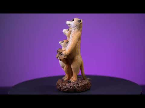 Bedårande familj av meerkats som har ett välkomnande skylt. Pälsstruktur och realistiska detaljer ser ut som det verkliga djuret. Tillverkad av robust polyresin med en lyxig, tung känsla. Mäter 6 tum.