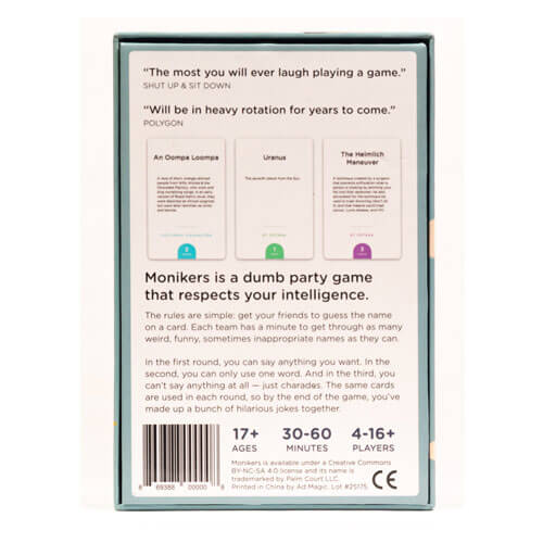Monikers är ett festspel baserat på kändis för allmänhetens domän, där spelare vänder sig för att försöka få sina lagkamrater att gissa namn genom att beskriva eller imitera välkända människor.