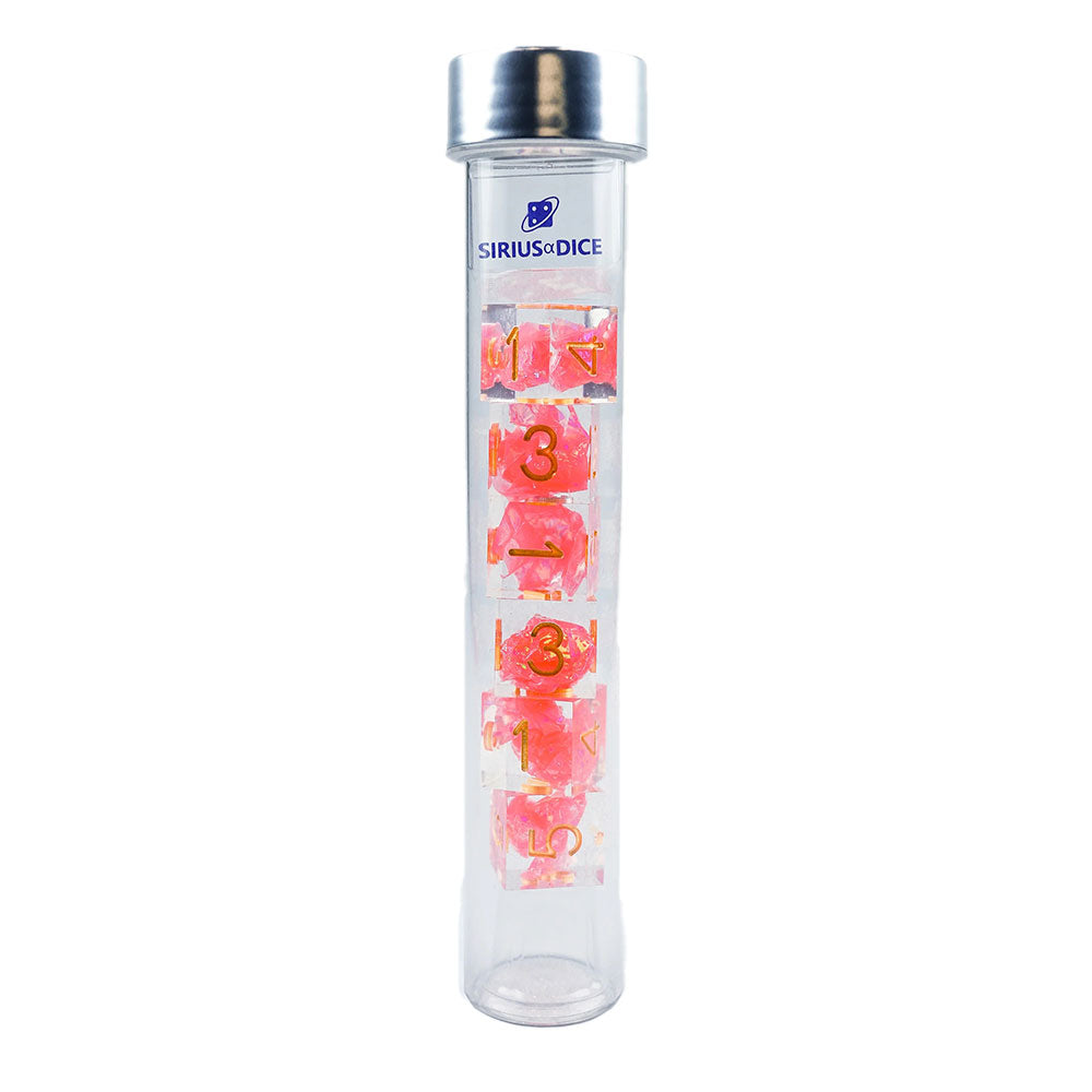 • Les dés sont clairs et présentent une boule tourbillonnante rose et dorée à leur cœur.