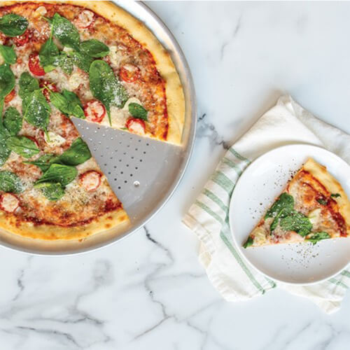 レストランがこのようなフライパンにピザを提供する理由があります。アルミニウムは暖房に偶然に最適な材料であり、燃焼を防ぐためのシールドとして機能します。このパンの小さな穴によって作成されたエアフローは、完全に鮮明な皮を確保します。 nubbyフィートは、切断の安定性を提供します。