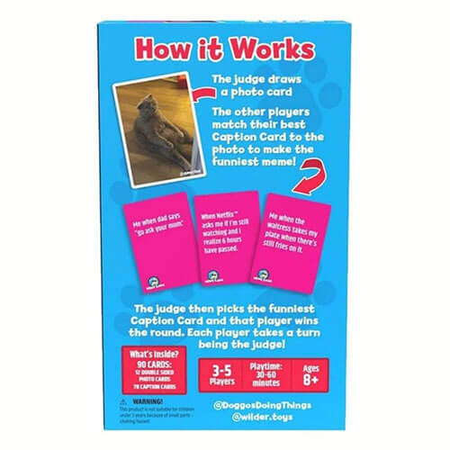 • 陽気な両面写真カードと最もおかしなキャプションカードが付属しています。