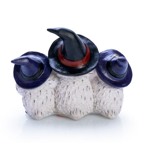 魔女の帽子をかぶった雪のようなフクロウの遊び心のある家族。羽毛のテクスチャーと黒いフレックのディテールは、本物の動物のように見えます。豪華で重い感じのある頑丈なポリエッシンで作られています。