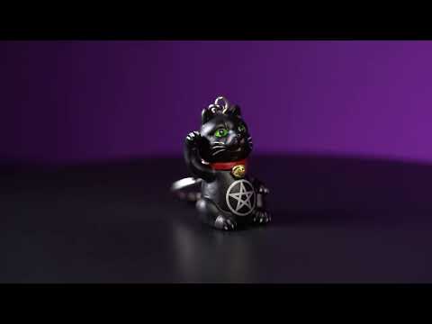 Mystieke sleutelhanger in de vorm van een gelukkige zwarte kat. Beschikt over levendige groene ogen, een gouden bel en pentacle -ontwerp op een traditionele sleutelhangerring