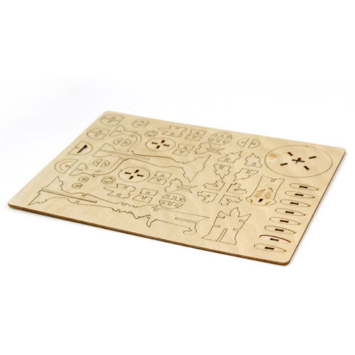 • Punch Out: bevat één lasergesneden, FSC -gecertificeerde houten vel met gemakkelijk verwijderbare stukken.