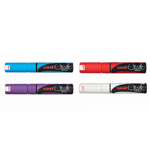 Uni flytende krittmarkører bruker vannbasert pigmentblekk, slik at du kan merke på vinduer, glass, speil, plast- og metalloverflater med letthet. Blekket vil ikke vaske av i regnet, men er likevel lett å fjerne med en fuktig klut. For permanent påføring kan markørene også brukes på tavler for en fet uttalelse.