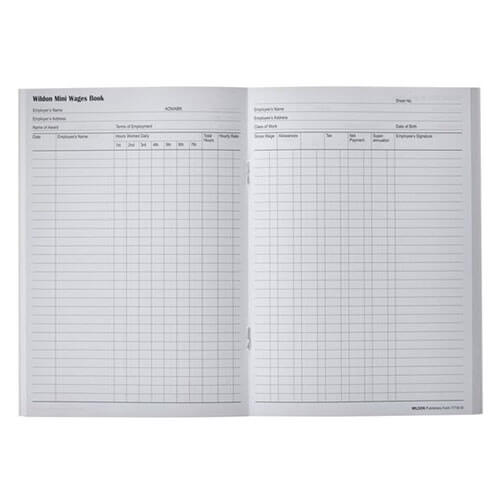 Denne Wildon 171W Mini lønnsbok er en enkel og effektiv måte å registrere timepriser og arbeidstid over en 7 dagers arbeidsuke. Denne boken er forhåndstrykt, så alt du trenger å gjøre er å fylle ut detaljene dine. Denne boken inneholder seksjoner for navn, tildeling, DOB, rente, timer, skatt, kvoter, superannuasjon og mer.
