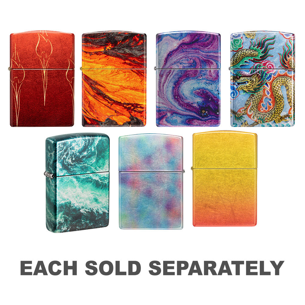 Zippo Dragon 540 Fusion Design Lost jest wykonany ze wszystkich metalowych konstrukcji, wiatroodporna konstrukcja działa praktycznie w dowolnym miejscu. Zupełnie nowa ewolucja dwóch naszych najbardziej poszukiwanych metod nadruku. Świecące metalowe elementy i eleganckie, półprzezroczyste palety kolorów, znak rozpoznawania procesu fuzji łączy siły z zastrzeżoną technologią 540 kolorów, aby otaczać zapalnice po wszystkich stronach dla płynnego, opalizującego i absolutnie oszałamiającego wyniku końcowego. Ten żywy smok design wiruje na czerwonym geometrycznym tle i jest uzupełnione logo wzdłuż jednej strony.