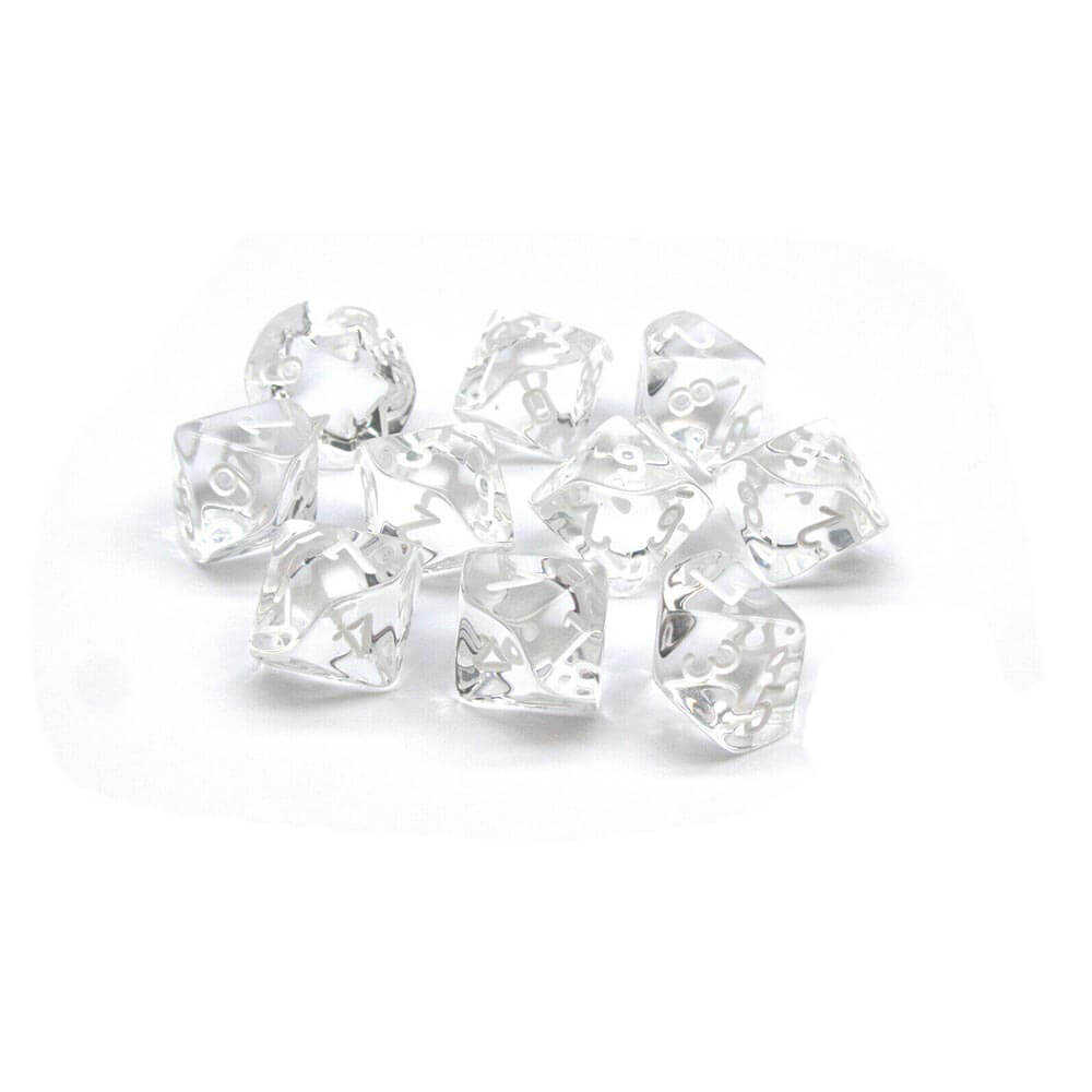 • Tio -sidiga die d10 -uppsättning - klar w/ vit genomskinlig (10)
