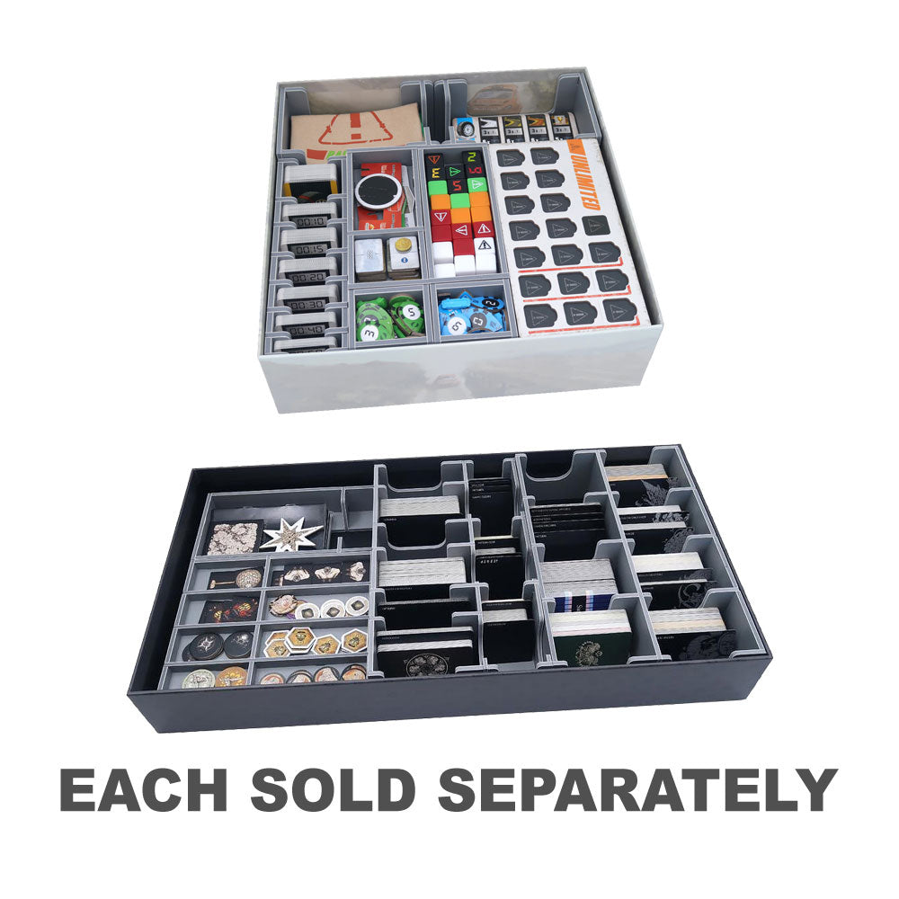 The insert is arranged in up to three layers. This product also includes two cardboard tuck boxes for storing separately the hexagon map tiles.