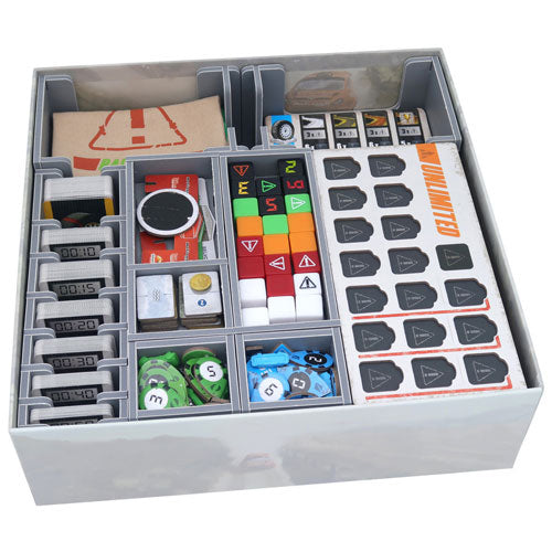 Insert compatible with Rallyman: DIRT®, including the 110%®, Climb®, Co-Pilot Pack®, R4®, R5® and Rx® expansions. The design provides both efficient storage and improved game play. Many of the trays can be utilised during the game, and they greatly aid set-up and clear-away times. The rule books act as a lid on top of the trays.