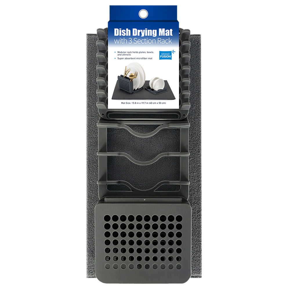 Este tapete de secagem de pratos da Grand Fusion inclui um rack de secagem modular de 3 seções (suporte da tigela, suporte para placas e organizador de utensílios). Este rack de secagem versátil permite conectar os componentes em diferentes configurações e vem com um tapete de microfibra para absorção extra.