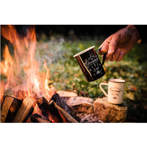 Conjunto de duas versões altas da caneca de esmalte de hardware dos cavalheiros. Vem em creme e preto. Diz "The Adventure Begins" e "The Adventure Never Ends", respectivamente.